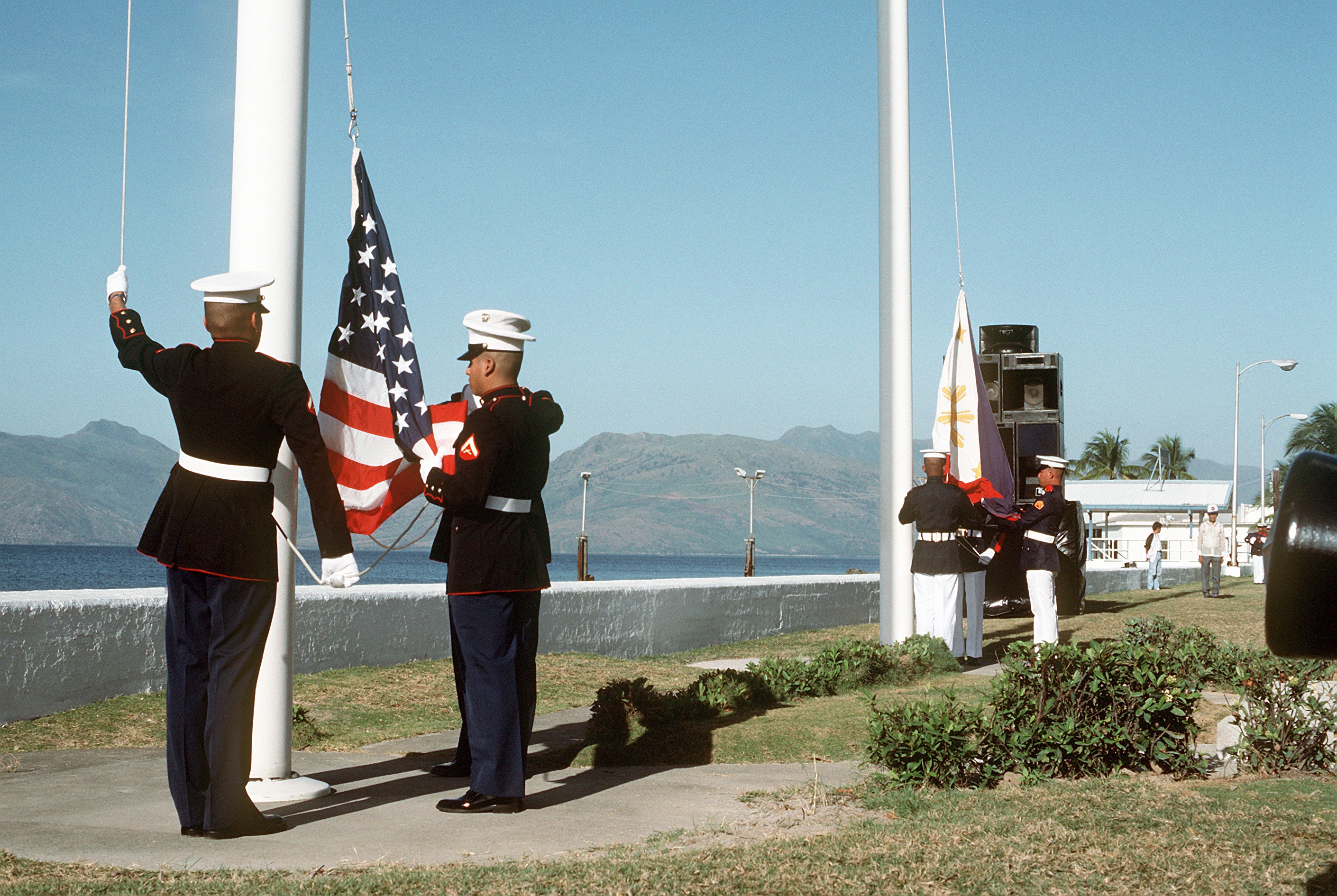 | Cờ Mỹ được hạ xuống và cờ Philippines được kéo lên khi căn cứ hải quân Mỹ tại vịnh Subic, Philippines, đóng cửa vào năm 1992. Ảnh: Wikimedia Commons. |