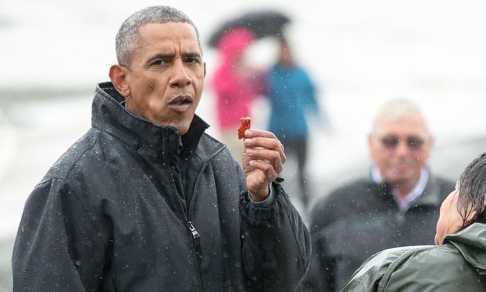 | Tổng thống Mỹ nếm thử một miếng cá hồi khô. Nhìn biểu hiện của ông, có lẽ nhiều người sẽ nghĩ món cá hồi khô sẽ không xuất hiện trong thực đơn tại Nhà Trắng. Ảnh: AP |
