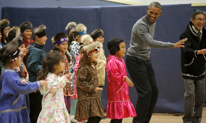 | Tại một ngôi trường ở thành phố Dillingham, ông Obama tham gia điệu nhảy truyền thống với các em nhỏ. Ảnh: Reuters |