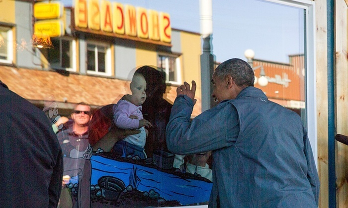 | Đương kim Tổng thống Mỹ đùa với một em bé qua cửa kính. Ảnh: AP |