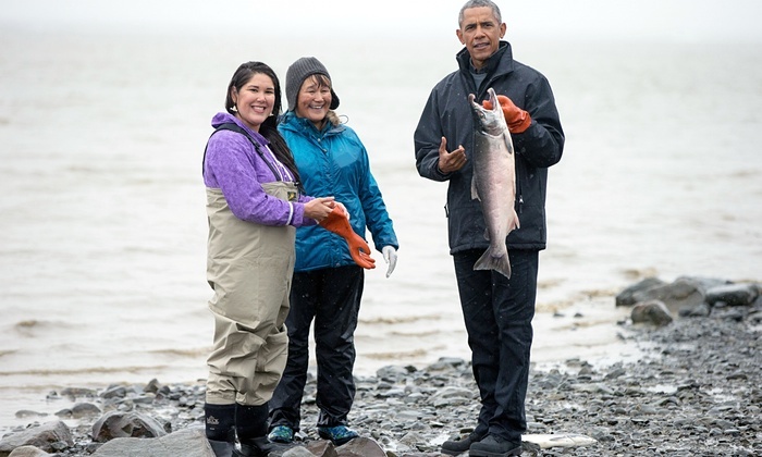 | Ông Obama cầm một con cá hồi lớn khi tới thăm ngư dân trên bãi biển Kanakanak. Ảnh: AP |