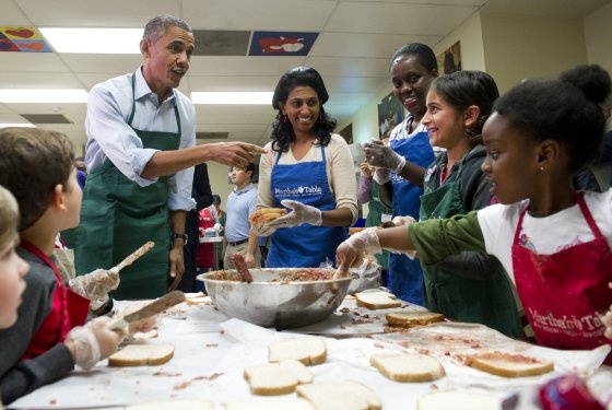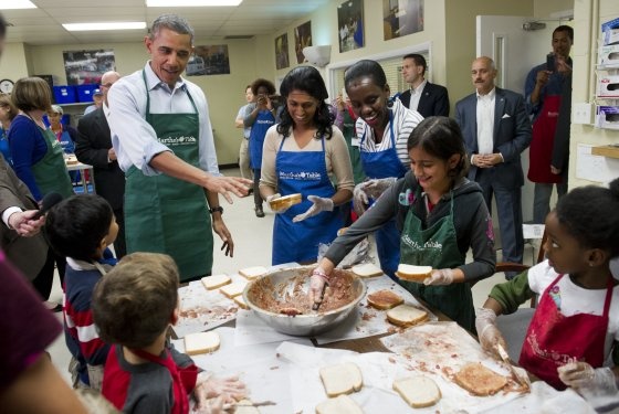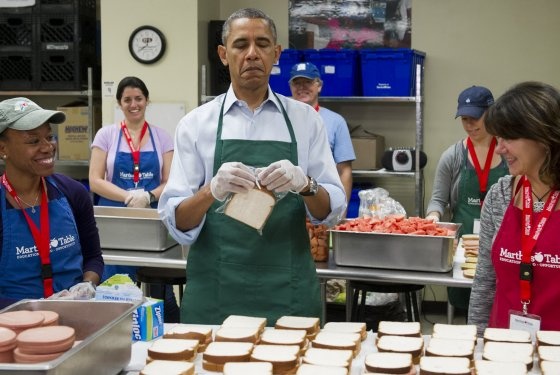 | "Trước khi bắt đầu, tôi chỉ muốn nói với các vị rằng phe Cộng hòa và những chiếc bánh sandwich này có một điểm chung: Cả hai đều là mớ hổ lốn", Obama chỉ trích đảng Cộng hòa trong lúc nói chuyện với những người trong bếp. Chính phủ Mỹ phải ngừng hoạt động sau khi quốc hội không thể thông qua dự luật ngân sách năm 2014 do bất đồng giữa đảng Dân chủ và đảng Cộng hòa về chương trình cải cách y tế của ông Obama (Obamacare). Ảnh: New York Magazine. |