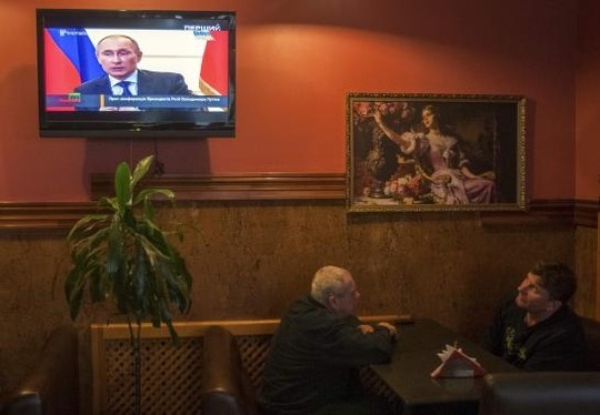 | Người dân Kiev theo dõi cuộc họp báo của Tổng thống Nga Putin hôm 4/03. Ảnh: Reuters. |