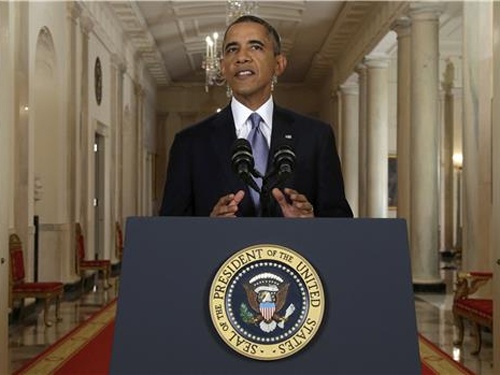 | Tổng thống Barack Obama đọc bài phát biểu trên truyền hình trong khoảng 15 phút. Ảnh: AP. |