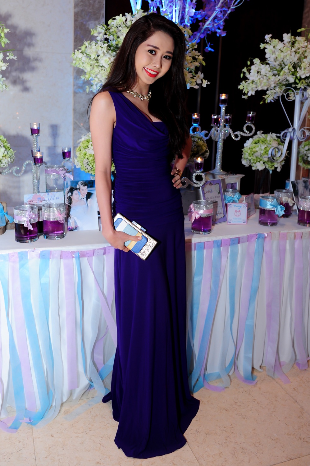 | Diễn viên Tường Vi diện đầm dạ hội sang trọng, tươi tắn bước vào sảnh tiệc. |