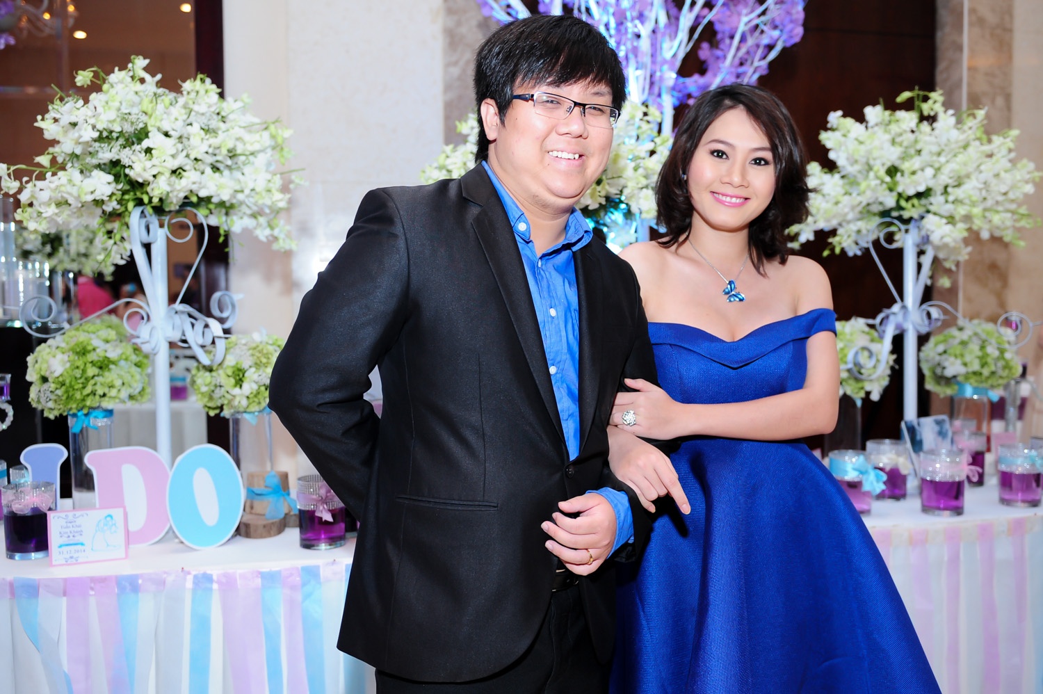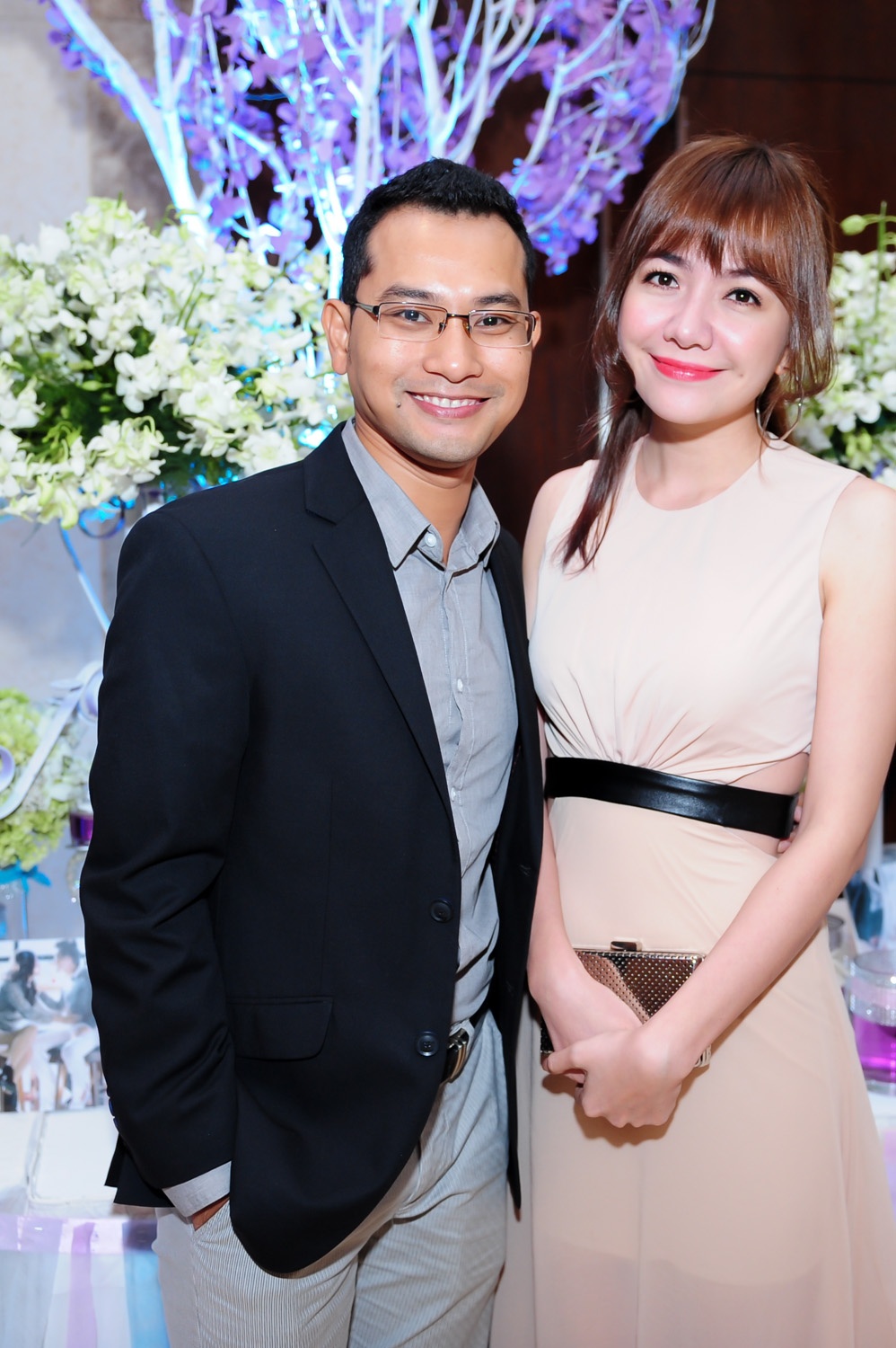 | Vợ chồng Gia Bảo diện trang phục đồng tông tình tứ tham dự tiệc mừng của đồng nghiệp. |