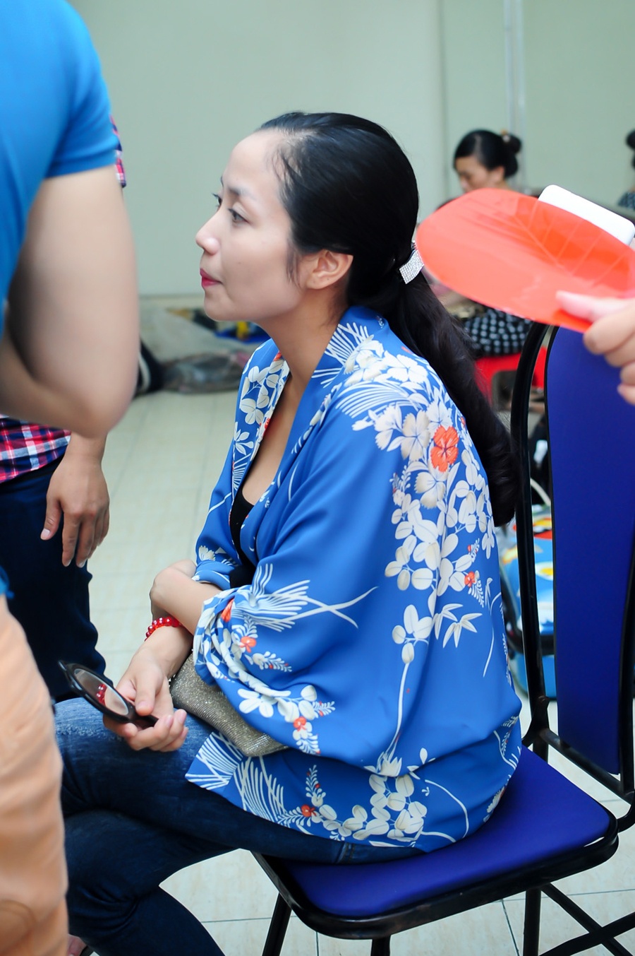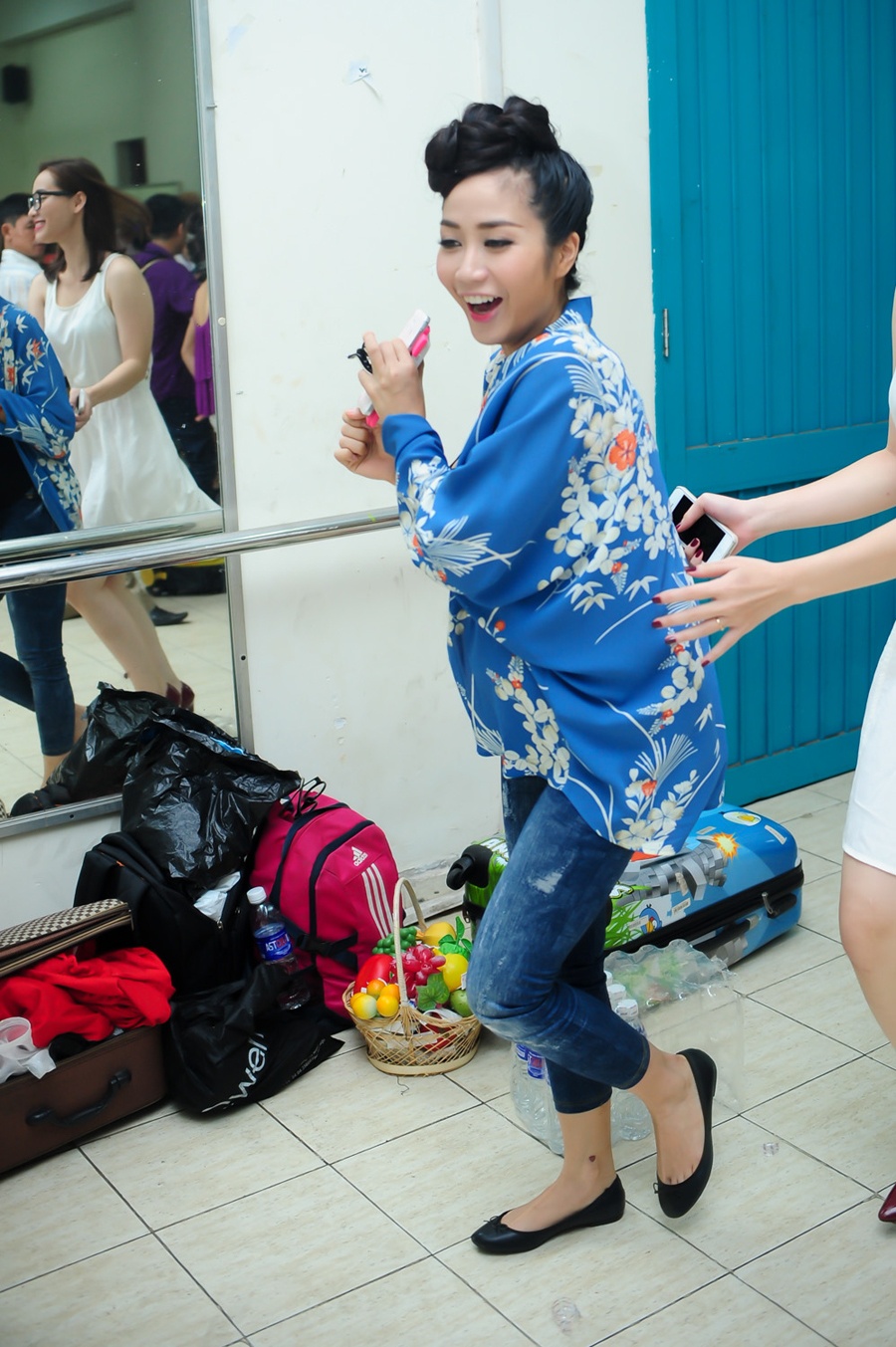 | Dù đang mang thai nhưng cô Ốc vẫn tỏ ra khá nhanh nhẹn, hoạt bát khi liên tục chạy ngược xuôi trong khu vực hậu trường để lo chu toàn mọi khâu chuẩn bị cho bản thân và các thí sinh nhí. |