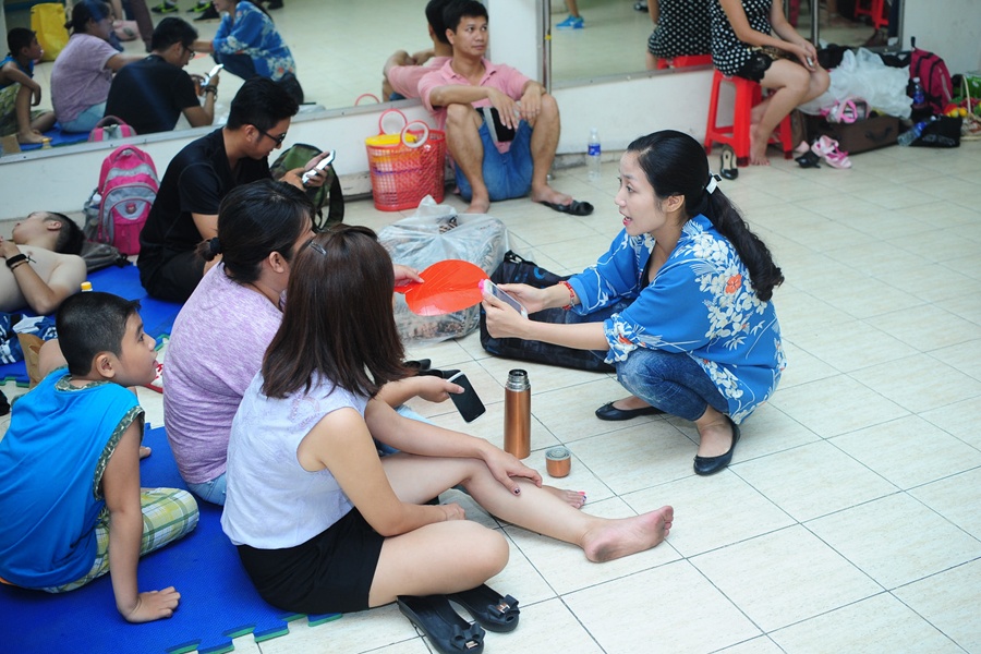 | Ốc Thanh Vân tận tình chia sẻ với các thí sinh mà mình hướng dẫn trước khi bước ra sân khấu. |