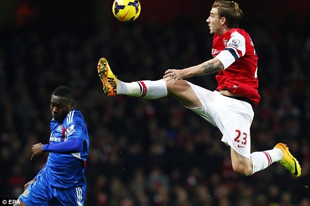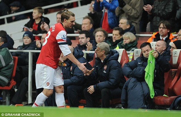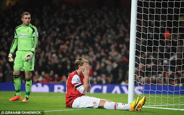 | Lần đầu tiên Bendtner được HLV Arsene Wenger điền tên vào danh sách đá chính tại giải Ngoại hạng Anh mùa này. |
