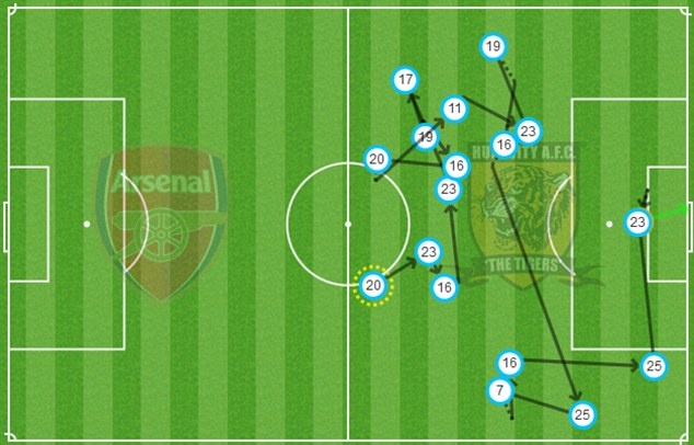 | Hình ảnh những pha phối hợp dẫn đến bàn mở tỷ số của Pháo thủ trước Hull City. |