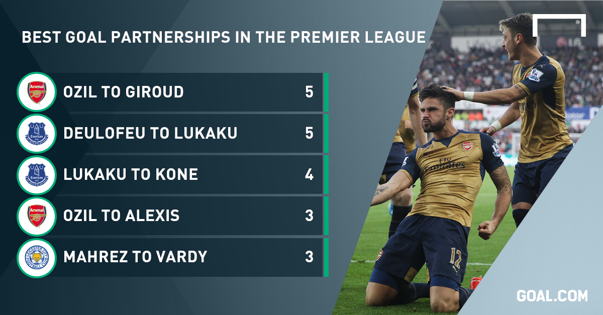 Đây là bộ đôi ăn ý hàng đầu Ngoại hạng Anh. Đáng chú ý là Oezil có 16 lần tạo cơ hội ngon ăn cho Giroud, vì vậy nếu tiền đạo người Pháp tận dụng cơ hội tốt hơn thì thành tích có lẽ còn cao hơn. Ngoài ra Oezil cũng kiến tạo cho Alexis Sanchez 3 bàn.