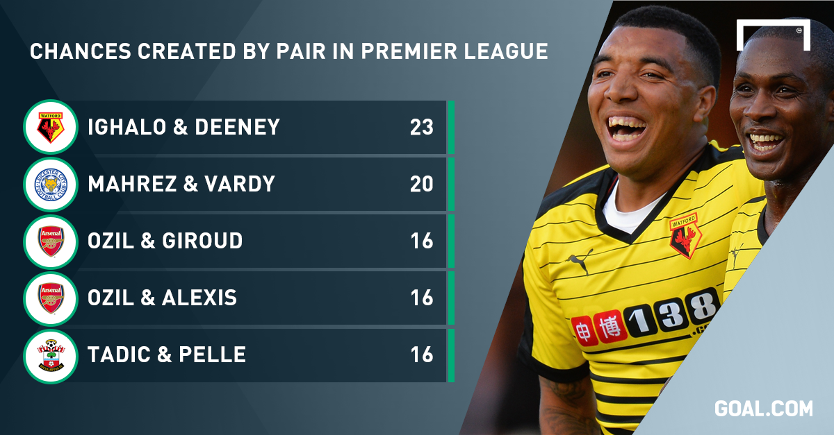 Ở thống kê số cơ hội tạo ra cho đồng đội, cặp Ighalo – Troy Deeney mới là cặp ăn ý nhất với 23 cơ hội ngon ăn tạo ra cho nhau. Hiện tại Ighalo có 8 bàn thắng còn Troy Deeney có 4 bàn.