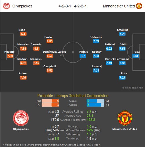 Dù đang có phong độ khá ổn định tại giải quốc nội mùa này, nhưng CLB chủ sân Karaiskakis vẫn không được đánh giá cao trước đội bóng giàu kinh nghiệm ở đấu trường châu Âu M.U. Trong quá khứ, hai đội gặp nhau 4 lần, và Olympiakos đều là bại tướng của Quỷ đỏ thành Manchester. Trong trận đấu diễn ra vào rạng sáng mai (ngày 26/2), một kết quả hòa cũng được xem là thành công với đội bóng của Hy Lạp trước M.U.
