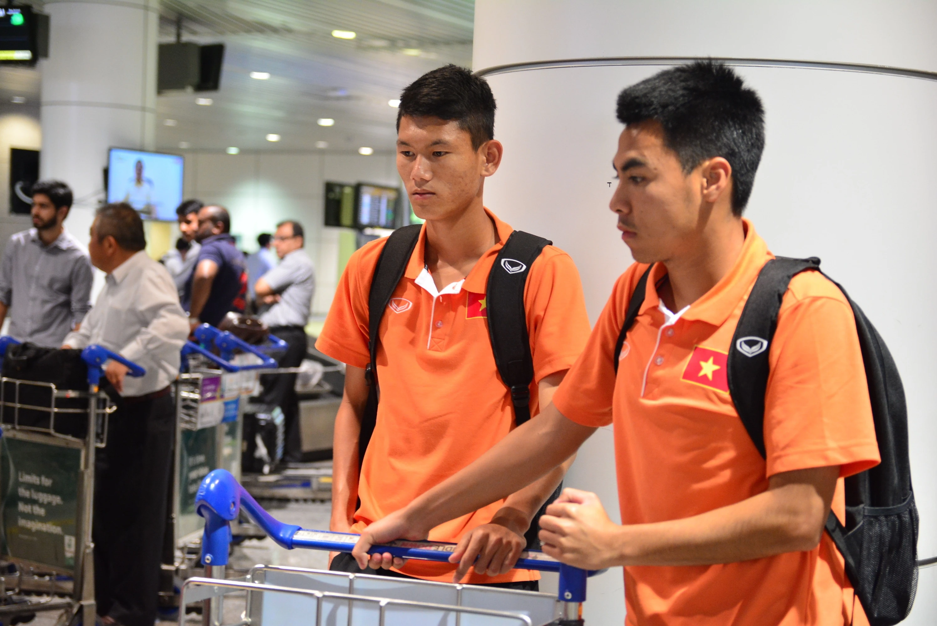 | Phan Văn Long và Phạm Đức Huy đứng chờ để lấy hành lý. Họ là 2 trong số 3 cầu thủ được bổ sung trước khi đội lên đường sang tham dự vòng loại U23 châu Á. Dù được HLV Miura tạo cơ hội, họ vẫn chưa để lại nhiều ấn tượng. |