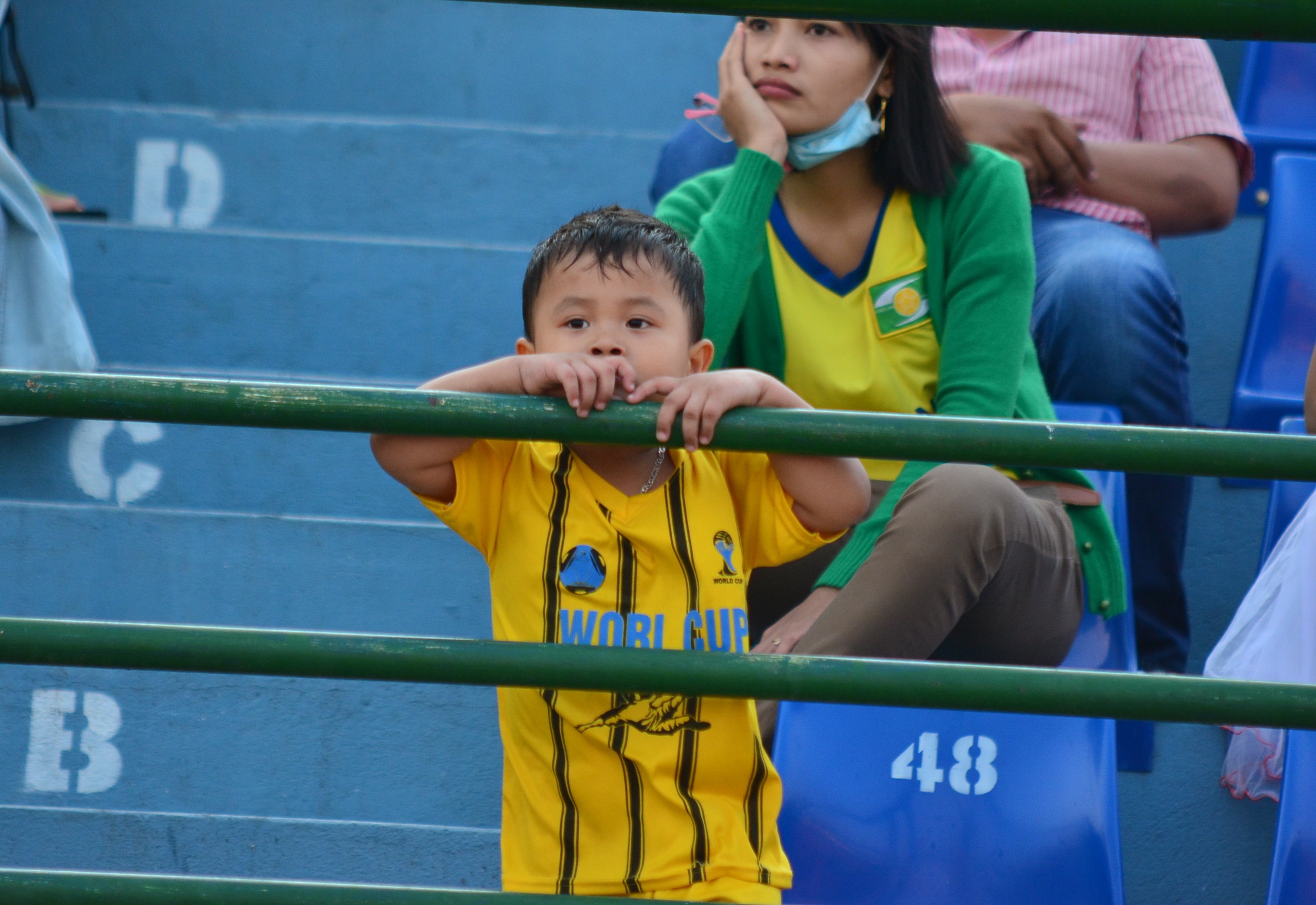 | Một cổ động viên nhí chăm chú xem các cầu thủ Olympic tập luyện. Sau trận, hàng loạt fan cuồng đã chặn đường Văn Toàn, Tuấn Anh, Công Phượng để xin chụp ảnh. |