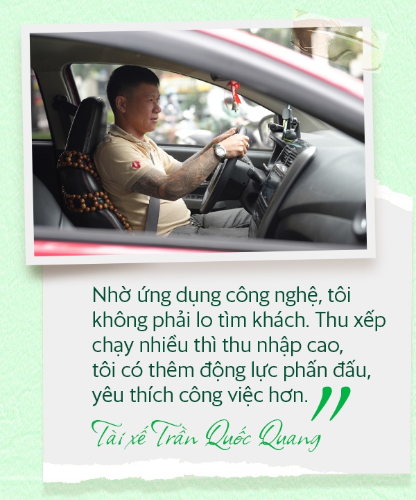 Từ cuộc sống chỉ dừng lại ở mức đủ ăn, mấy năm nay, anh Quang để dành được một khoản dự phòng nhờ công việc chạy xe công nghệ. “Nhờ ứng dụng công nghệ luôn được cải tiến để kết nối tài xế với người dùng tốt hơn, tôi không phải lo việc tìm khách, thiếu khách nên cứ tập trung vào việc lái xe. Thu xếp chạy được nhiều thì thu nhập cao. Từ đó, tôi có thêm động lực phấn đấu, yêu thích công việc hơn”, anh chia sẻ.