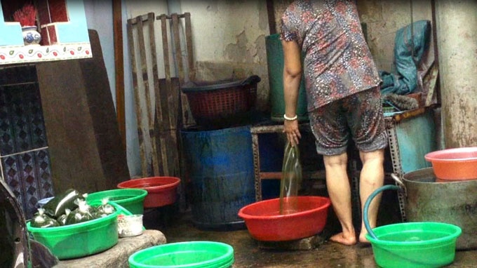 Ngày 17/12, chúng tôi tiếp cận căn nhà 71/32 Trần Phú, P.4, Q.5 nằm trong con hẻm đường Trần Phú. Lúc này, một phụ nữ tên Linh liên tục dùng chân giẫm đạp lên sương sâm trước khi múc từng thau nước lã đổ vào máy xay.