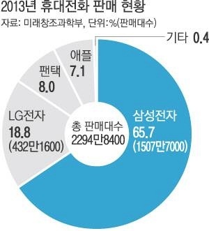 | Tình hình bán lẻ smartphone Hàn Quốc 2013: Samsung 65,7%, LG 18,8%, Pantech 8%, Apple 7,1%. |