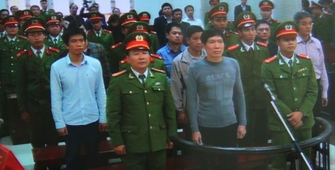 | Bị cáo Dương Tự Trọng và các đồng phạm tại phiên tòa sơ thẩm. Ảnh: Đỗ Mến. |