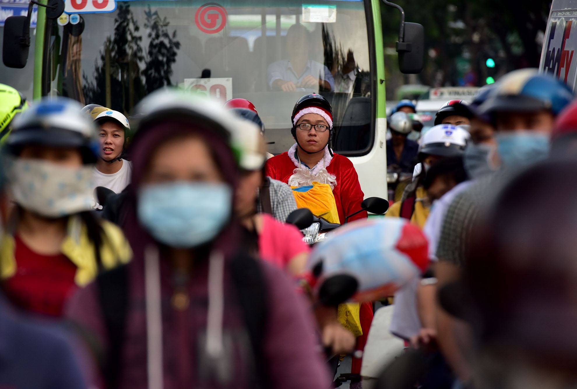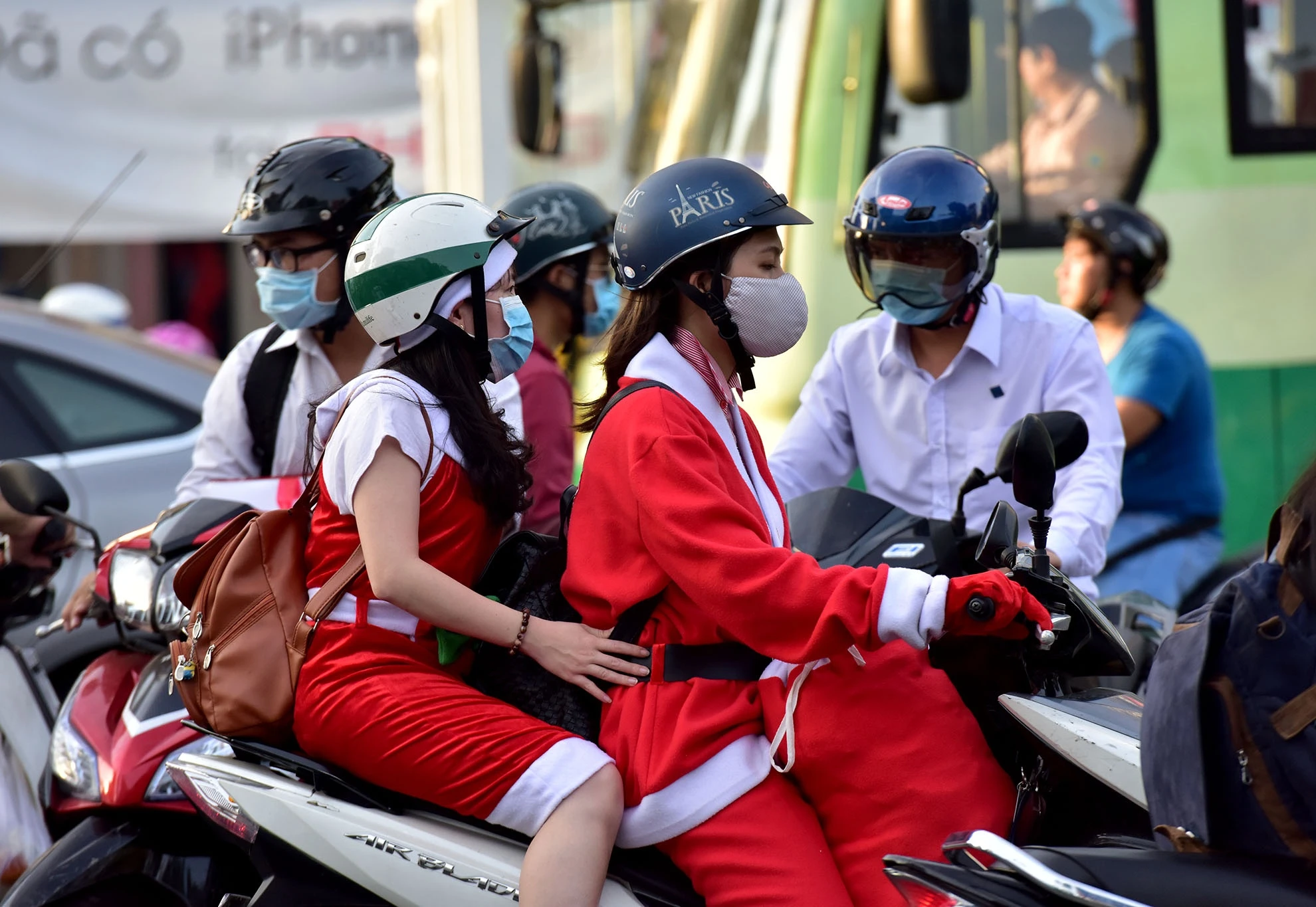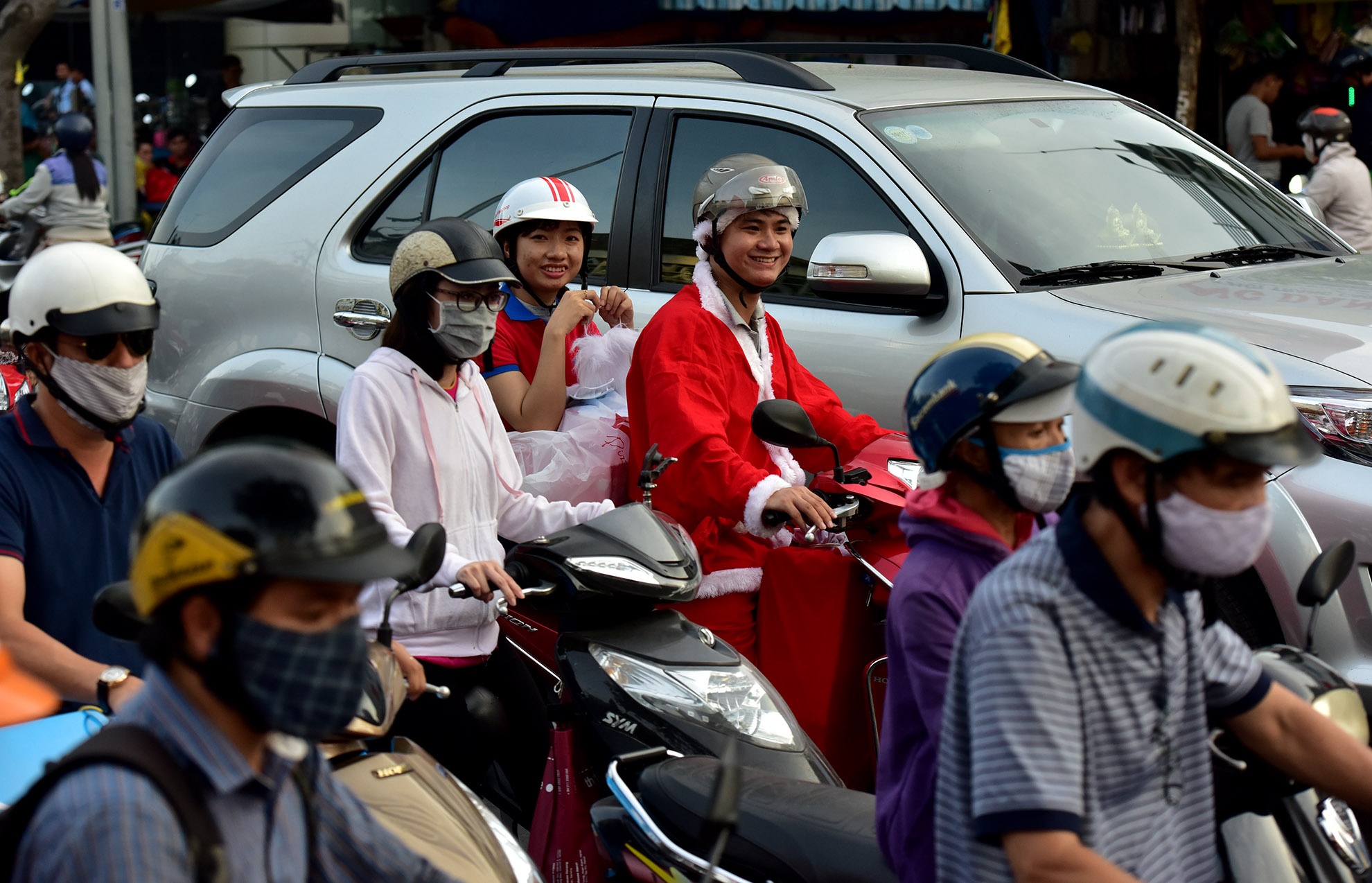 | Lác đác người mặc trang phục ông già Noel đi xe máy giữa dòng phương tiện. |