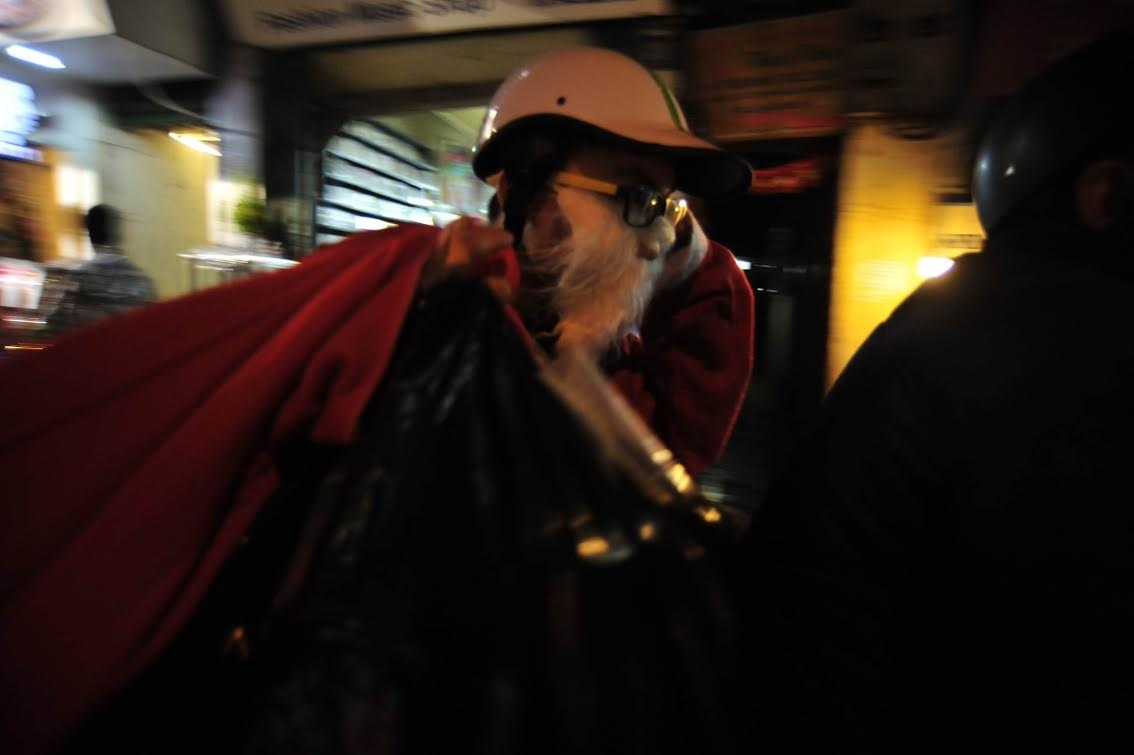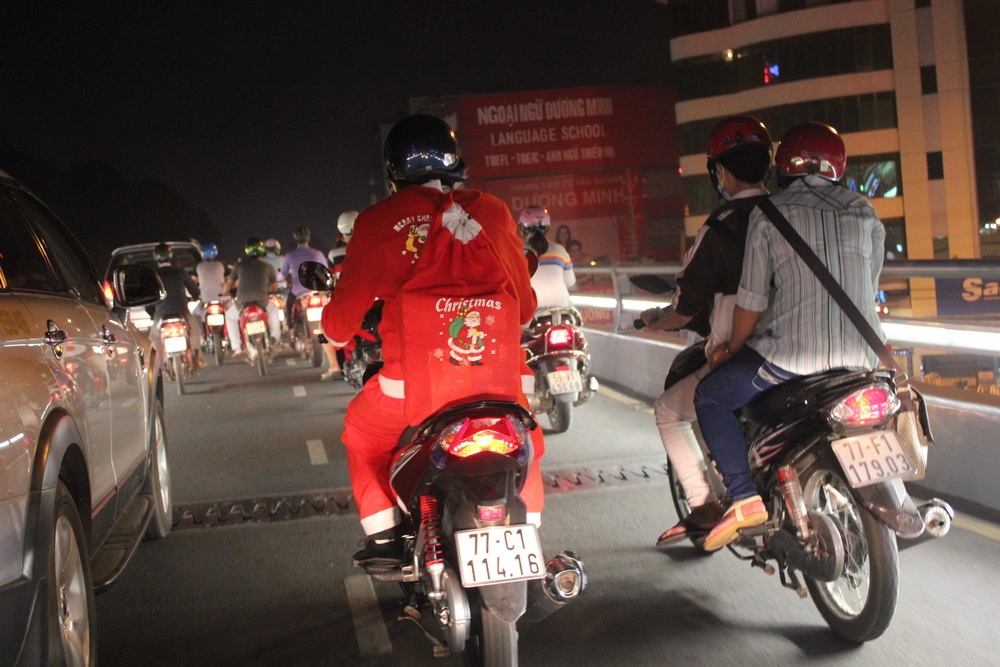 | Ông già Noel Sài Gòn cố gắng vượt qua những đôi bạn trẻ đi chơi đêm Giáng sinh trên cầu vượt Lăng Cha Cả. |