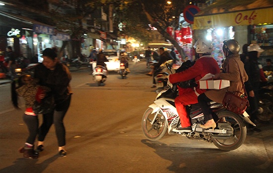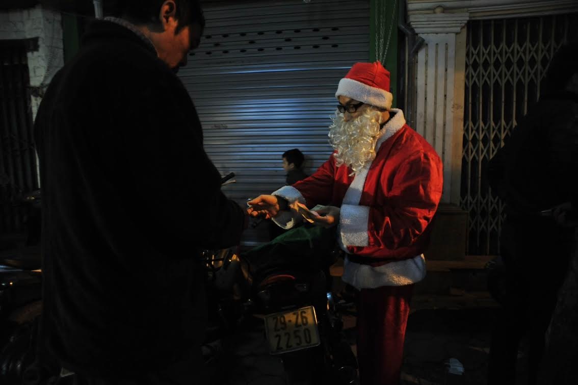| Trong khi đó, ở Hà Nội, vượt qua giá lạnh và tắc đường, nhiều ông già Noel cũng đang đưa những món quà cuối cùng. |