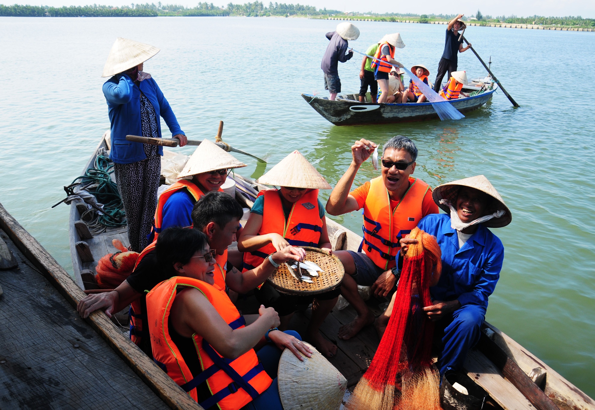Nhân dịp này, nhiều đoàn khách quốc tế cũng đổ về phố cổ Hội An du lịch. Trong ảnh, nhóm du khách Singapore trải nghiệm quăng chài lưới trên sông Cổ Cò.