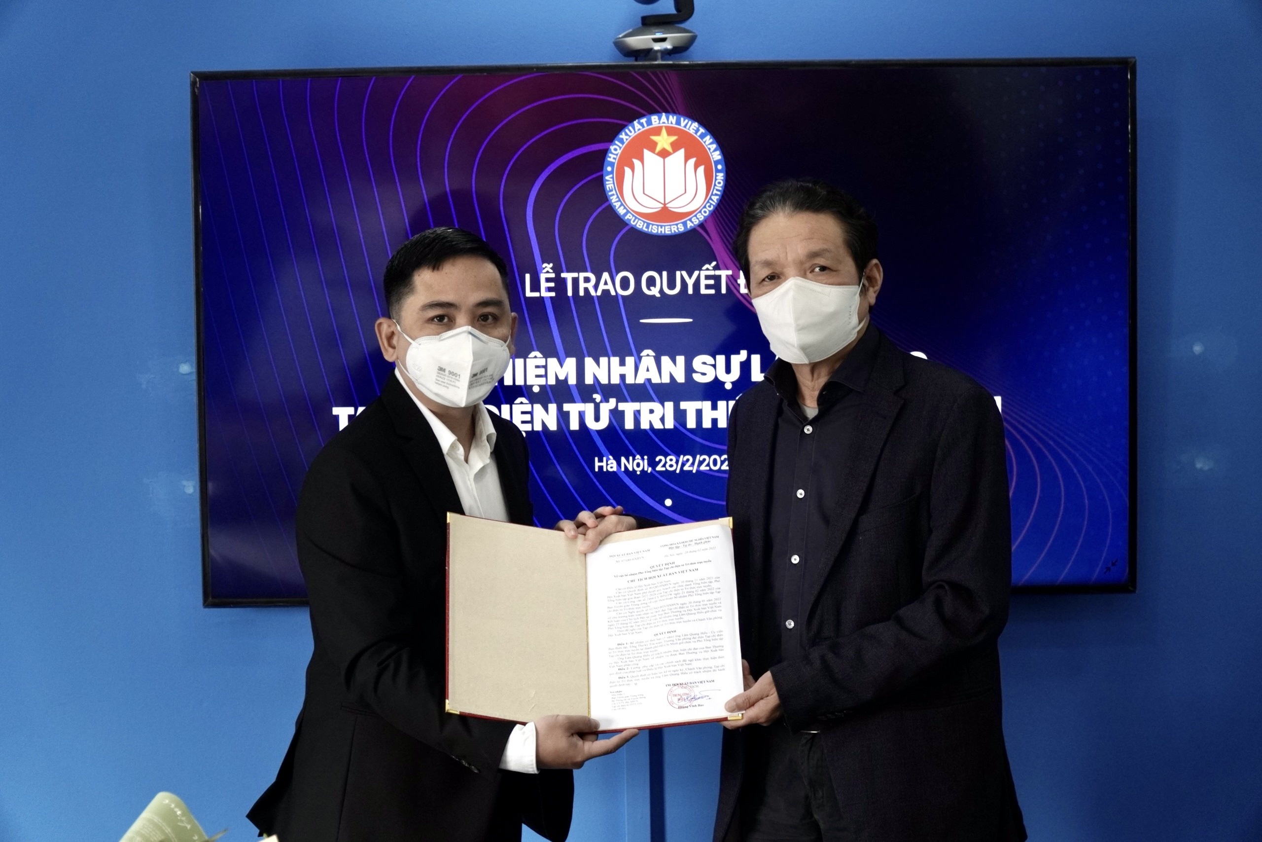 | Chủ tịch Hội Xuất bản Việt Nam Hoàng Vĩnh Bảo trao quyết định bổ nhiệm Phó tổng biên tập Tạp chí điện tử Tri thức trực tuyến (Zing News) cho ông Lâm Quang Hiếu (trái). Ảnh: Thuận Thắng. |