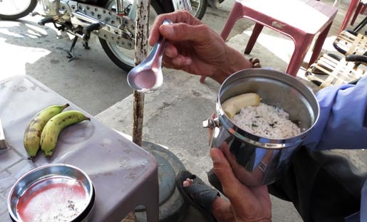 | Bữa cơm trưa chỉ có cơm trắng và quả chuối của ông Năm. |