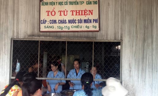 | Bà Lâm Thị Nết (mặc áo xanh ở giữa), vợ ông "Năm tàu hũ" đang phát cơm từ thiện cho bệnh nhân Bệnh viện Y học cổ truyền. |