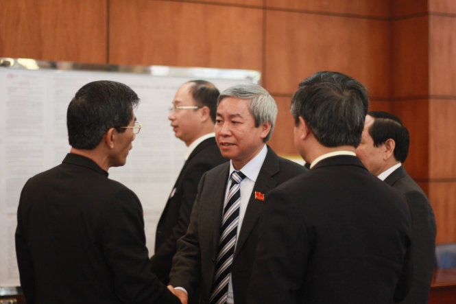 | Ông Dương Anh Điền, Chủ tịch HĐND TP Hải Phòng nhiệm kỳ 2011-2016 trao đổi với các đại biểu bên lề kỳ họp HĐND thành phố khóa XIV. |