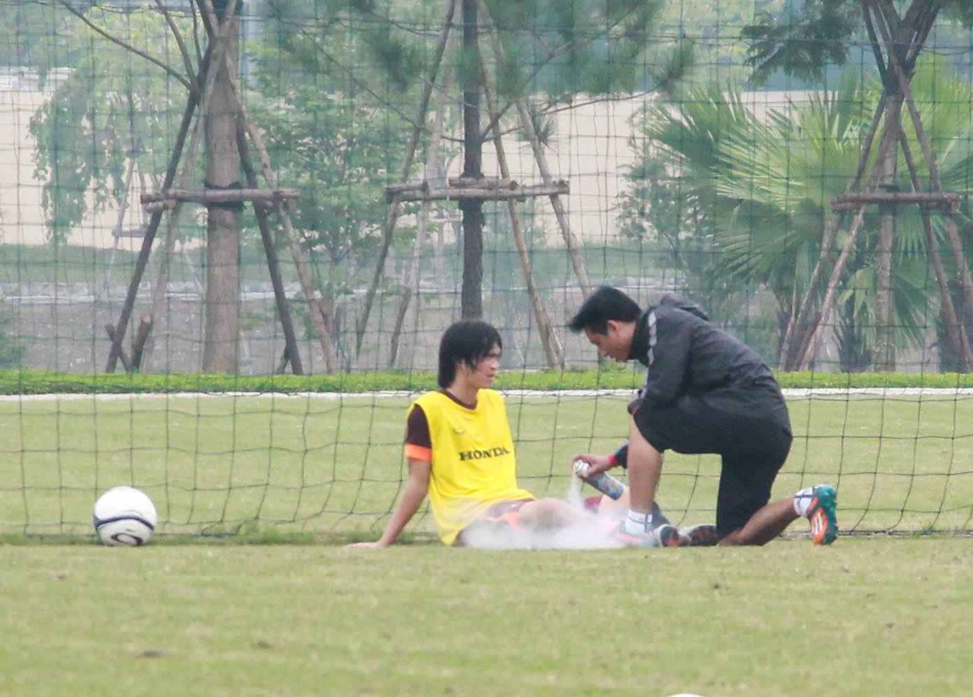 Tiền vệ tương lai của Yokohama được xịt hơi lạnh giảm đau bên lề sân thi đấu.