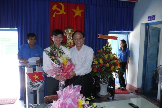 | Bí thư Tỉnh ủy Bình Định Nguyễn Văn Thiện (bên phải) tặng hoa chúc mừng ông Nguyễn Minh Triết lúc ông Triết về làm Phó bí thư Tỉnh đoàn Bình Định. |