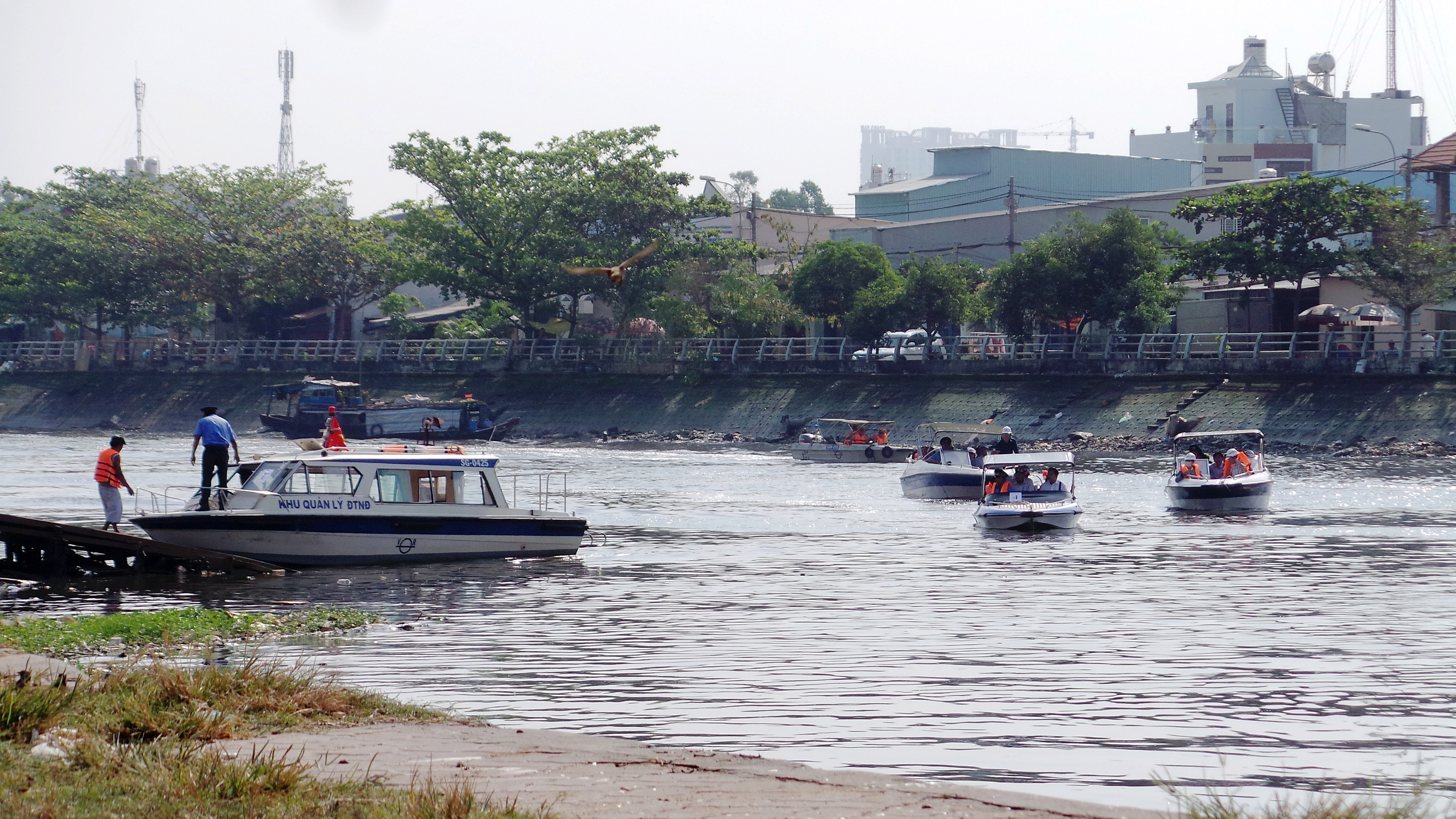 | Đoàn lãnh đạo TP HCM và đại diện JICA khảo sát tuyến kênh Đôi, kênh Tẻ. Ảnh: Trường Nguyên. |