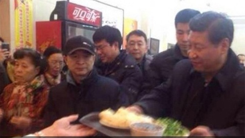 | Ông Tập Cận Bình (bên phải) nhận khay đồ ăn trong nhà hàng màn thầu tại Bắc Kinh hôm 28/12. Ảnh: chinasmack.com |