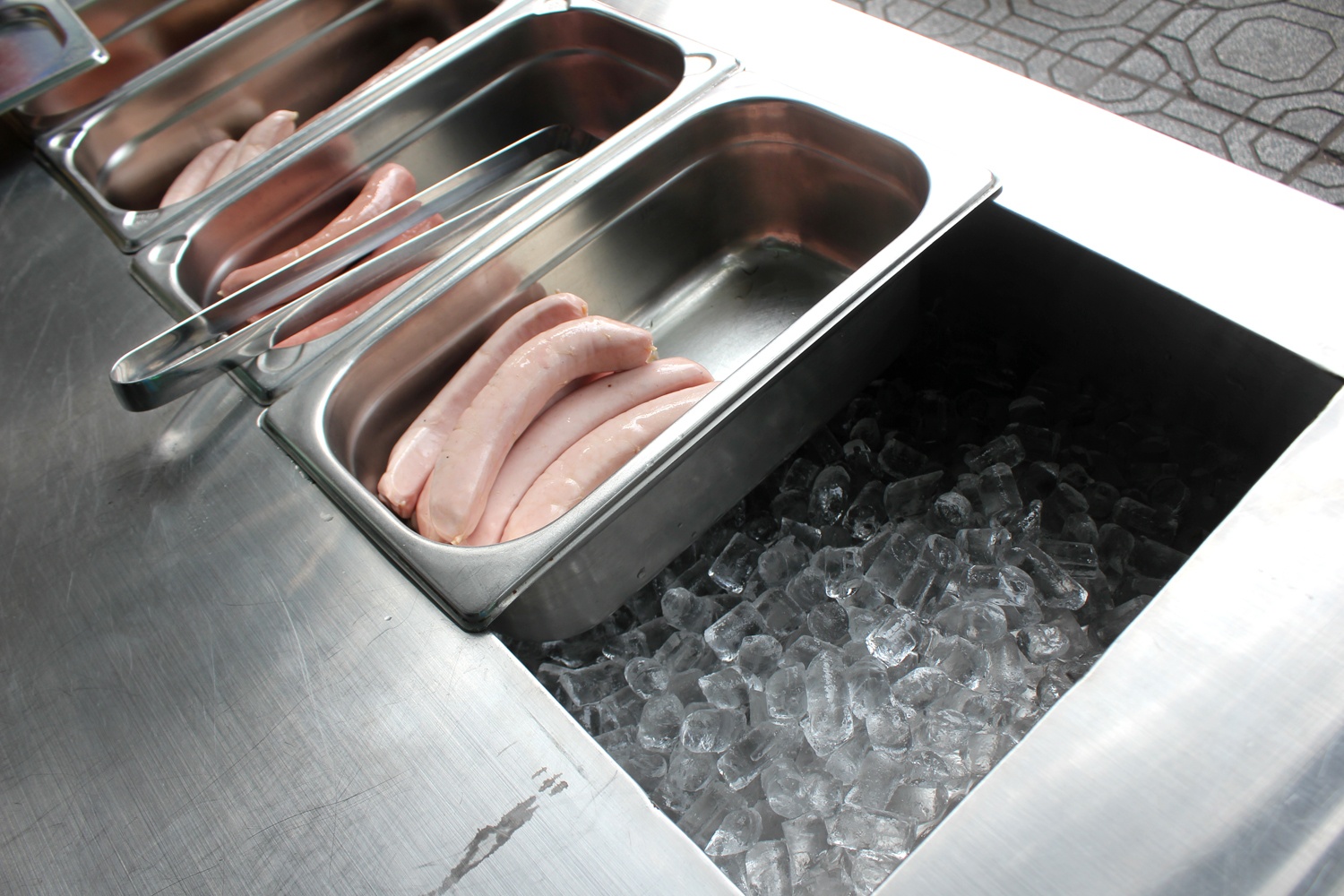 Phía dưới khay đựng là hộc đá để giữ xúc xích luôn tươi. Mỗi buổi bán xe tiêu thụ hết 5-10 kg đá. Ảnh: Zen Nguyễn. |