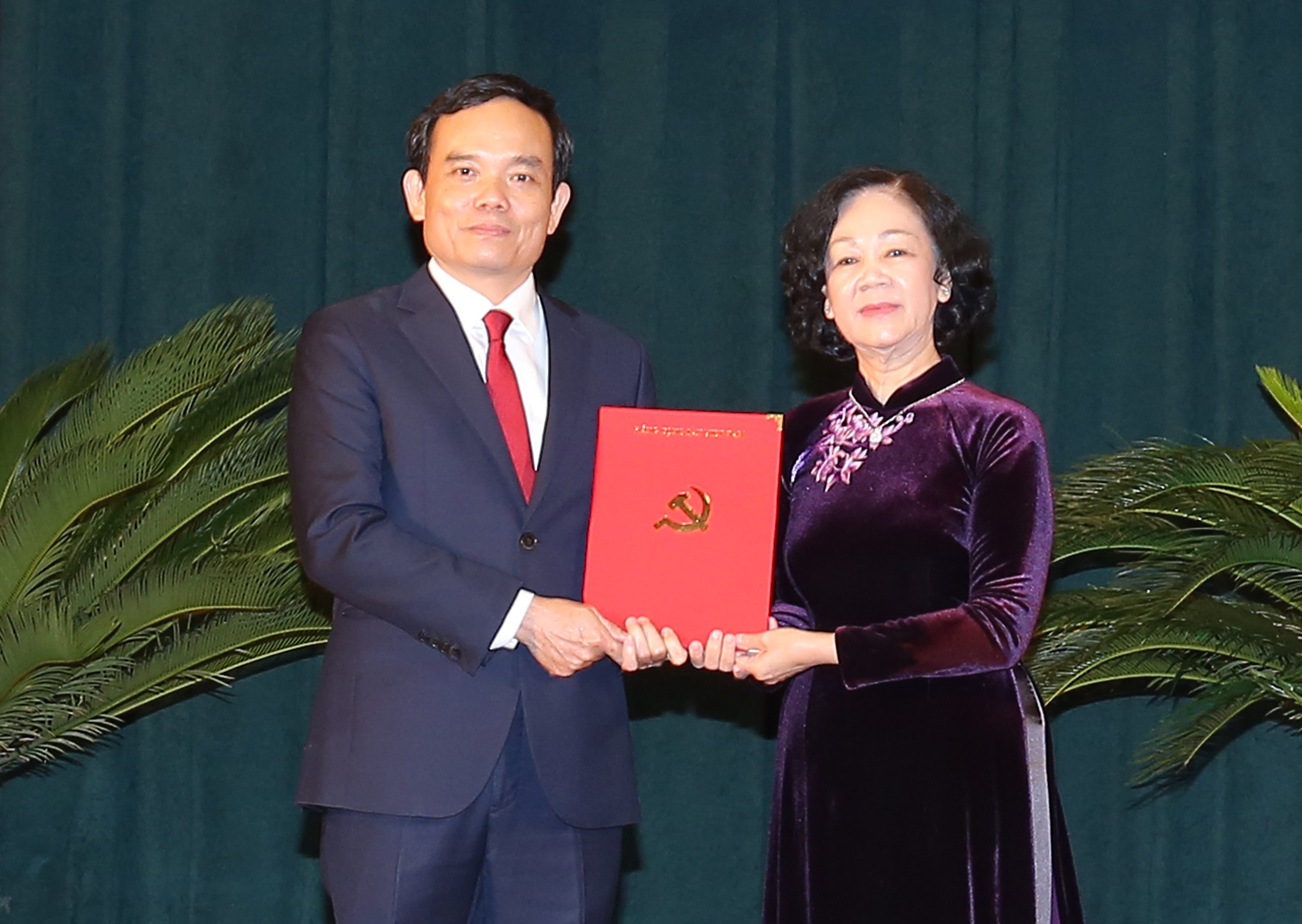 | Ông Trần Lưu Quang nhận quyết định của Bộ Chính trị từ bà Trương Thị Mai. Ảnh: Duy Thịnh. |