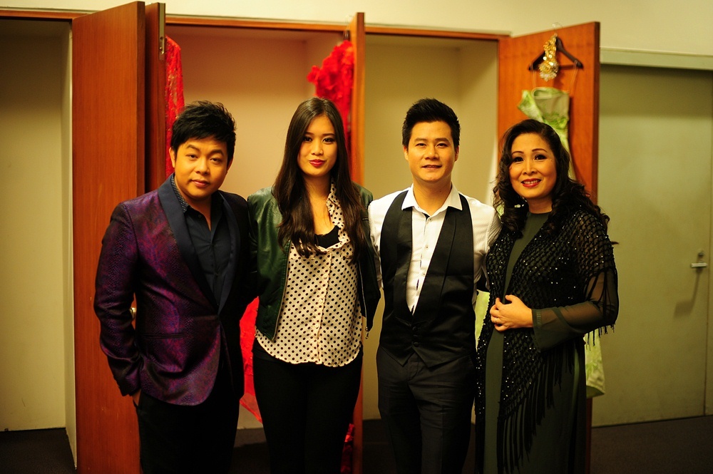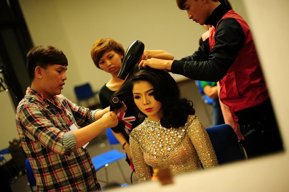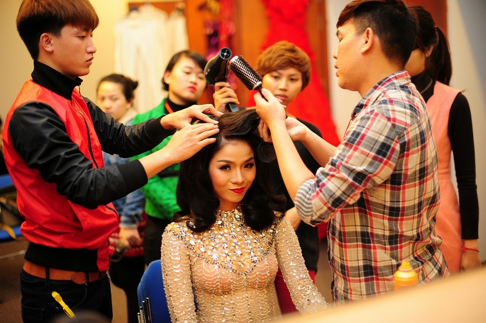 | Ê-kíp hậu trường của phụ trách phần trang điểm, làm tóc và thay đồ cho Lệ Quyên cũng rất hùng hậu. Cô chỉ có vài phút để đổi kiểu tóc rồi thay trang phục trong khi các nghệ sĩ khách mời đang biểu diễn nên cần sự trợ giúp của nhiều người. |