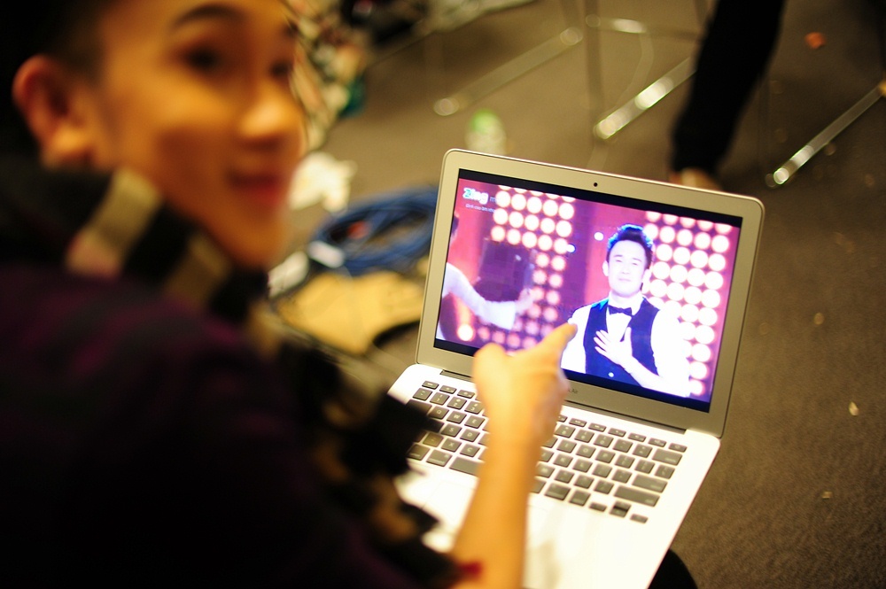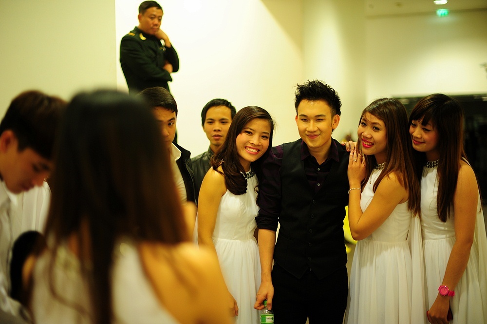 | Dương Triệu Vũ thân thiện chup hình cùng các vũ công và ca sĩ hát bè của chương trình ở phía hậu trường. |