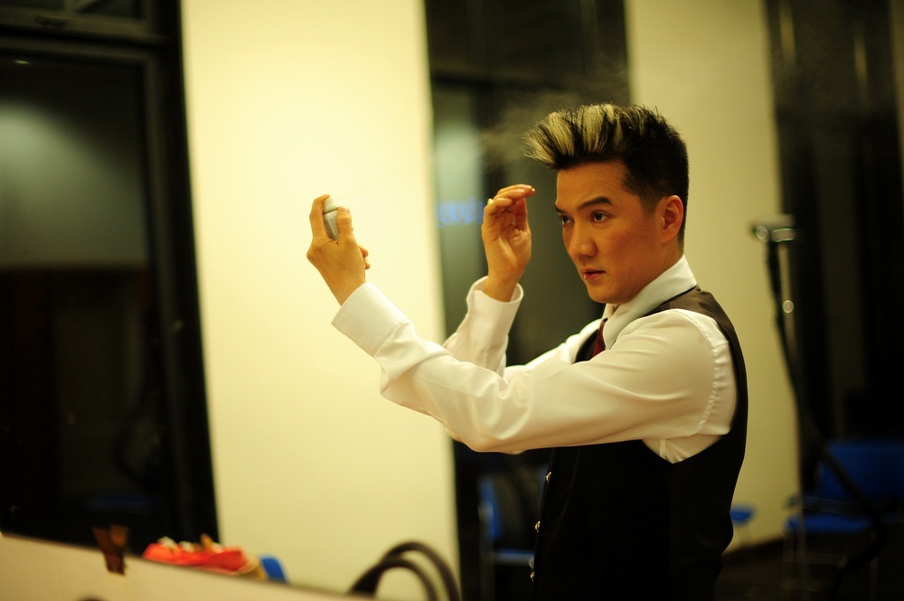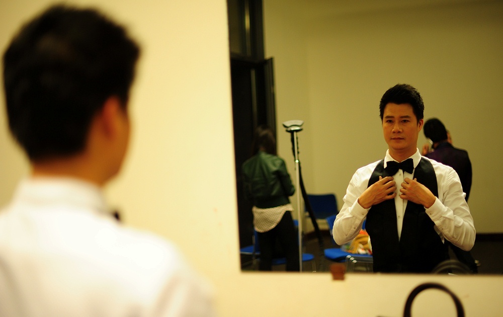 | Mr. Đàm tự mình chỉnh trang đầu tóc và trang điểm nhẹ nhàng trước khi lên sân khấu. |