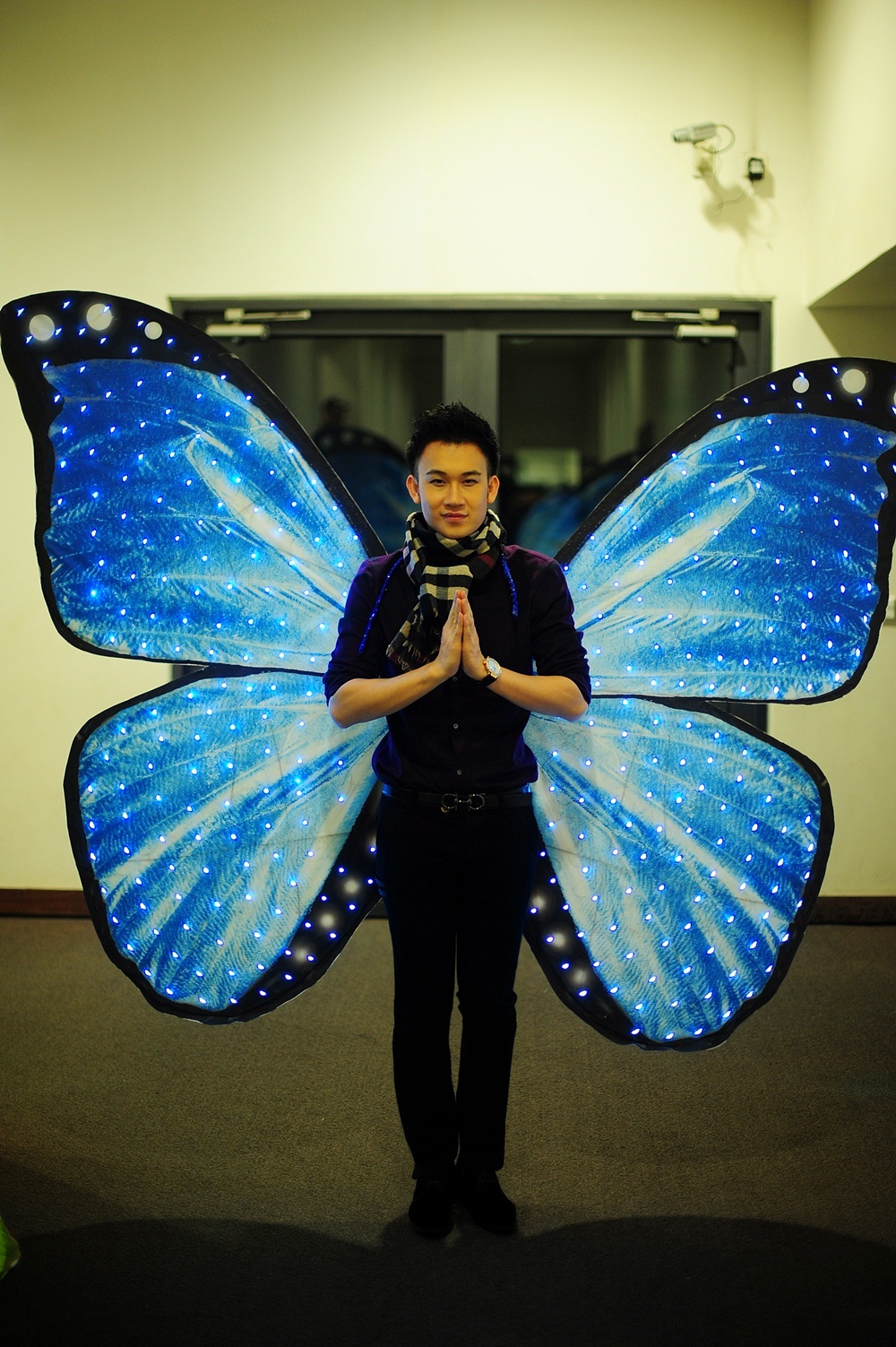 | Dương Triệu Vũ là nhân vật khách mời mở màn của Q Show. Khi nhiệm vụ kết thúc, anh chàng thảnh thơi chờ tới phần trình diễn kết chương trình nên tinh nghịch lấy đạo cụ của các diễn viên múa ra tạo dáng. |