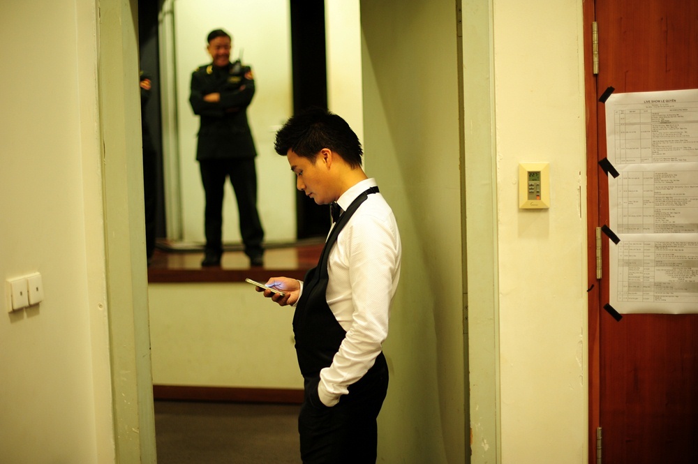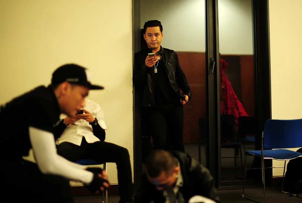 | Tuấn Hưng mặt lạnh nghịch điện thoại trong khi chờ tới phần trình diễn của mình. Nam ca sĩ hát cuối cùng nhưng vẫn có mặt ở phía hậu trường từ rất sớm. |