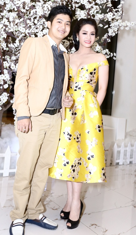 | Nhật Kim Anh bẽn lẽn tạo dáng bên ông xã trước khi chương trình bắt đầu. Cô chọn cho mình mẫu váy hoa màu vàng, khoe làn da trắng nõn, mịn màng. Phần cổ thuyền được xẻ sâu giúp người đẹp khoe khéo vòng một. |