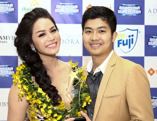 Giọng ca "Lâu đài cát" hạnh phúc bên ông xã sau khi được xướng tên cho ngôi vị cao nhất của cuộc thi âm nhạc dành cho các diễn viên - Sao Việt toàn năng - tối 18/1 tại TP.HCM.