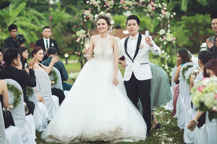 Trải qua hành trình 2 năm yêu và vượt những rào cản dư luận, cặp đôi tận hưởng hạnh phúc trong ngày vui của mình. Trong ảnh, họ cùng nâng ly khi nhận lời chúc phúc từ bạn bè. Ảnh: An Trần.