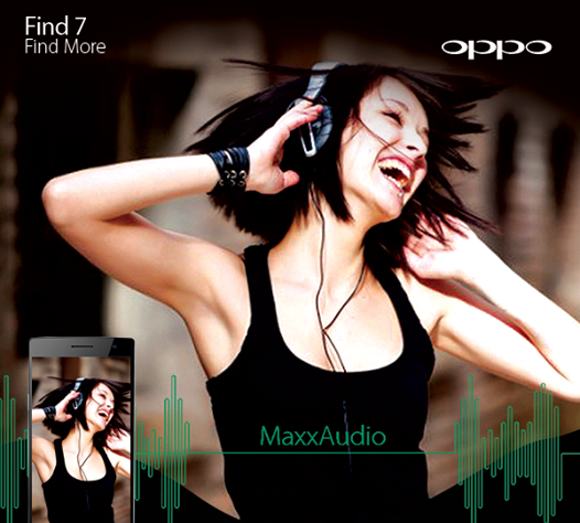 Find 7A được OPPO tích hợp công nghệ âm thanh MaxxAudio. Đây là công nghệ từng được giải thưởng Technical GRAMMY - giải pháp âm thành dành cho 20 nghìn studio chuyên nghiệp hàng đầu thế giới. OPPO Find 7A sở hữu chất âm riêng, có thế mạnh ở các thể loại nhạc dance, electro, vocal.