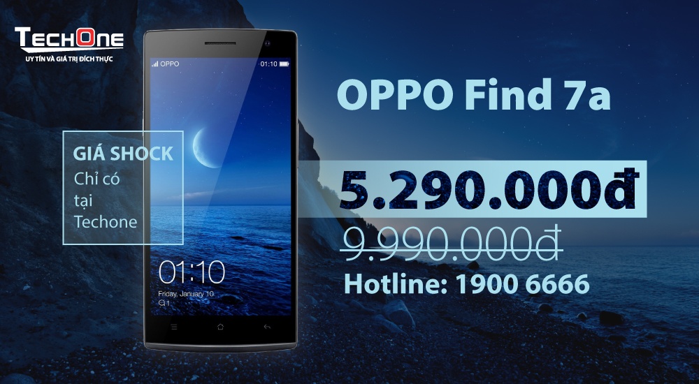 Hiện nay, TechOne là đại lý chính hãng duy nhất được OPPO ủy quyền bán sản phẩm OPPO Find 7A với giá chỉ 5,29 triệu đồng cùng khuyến mãi lớn và chế độ bảo hành 12 tháng chính hãng. Khách hàng muốn mua sản phẩm có thể đến với Hệ thống TechOne trên toàn quốc hoặc đặt mua online tại 1900.6666 để được gửi hàng và thanh toán tận nhà.