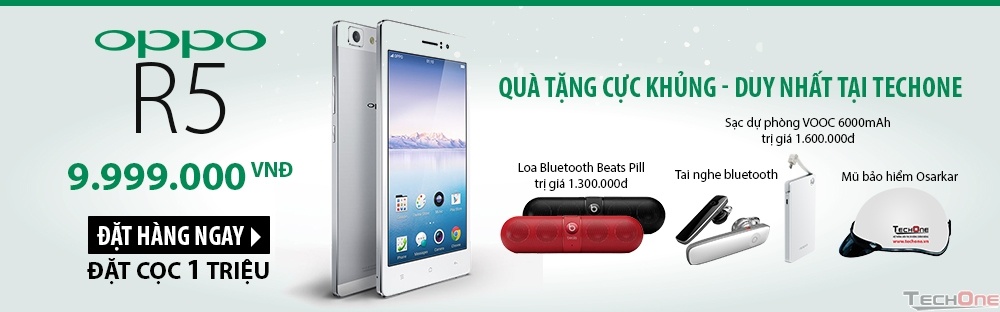 Ngoài ra, cũng phải kể đến OPPO R5 - mẫu điện thoại đang nắm giữ ngôi vương cho smartphone mỏng nhất thế giới vào thời điểm hiện tại. Với kiểu dáng mỏng tinh tế, cấu hình mạnh mẽ, camera nét cùng công nghệ bậc nhất, OPPO R5 đang có nguy cơ cháy hàng dù chưa được lên kệ. Hiện tại, OPPO R5 đang có mức giá 9,99 triệu đồng và khách hàng đã có thể đặt trước sản phẩm này tại hệ thống siêu thị điện thoại TechOne hoặc đặt hàng online trên website của TechOne tại đây.