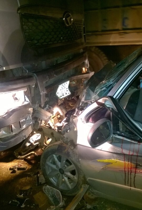 Tại hiện trường, chiếc xe 4 chỗ biến dạng, bẹp nát phần đầu, kính xe vỡ vụn, máu và quần áo nạn nhân vương vãi khắp thùng xe. Đầu ôtô tải cũng bị móp méo, hư hỏng nhẹ.