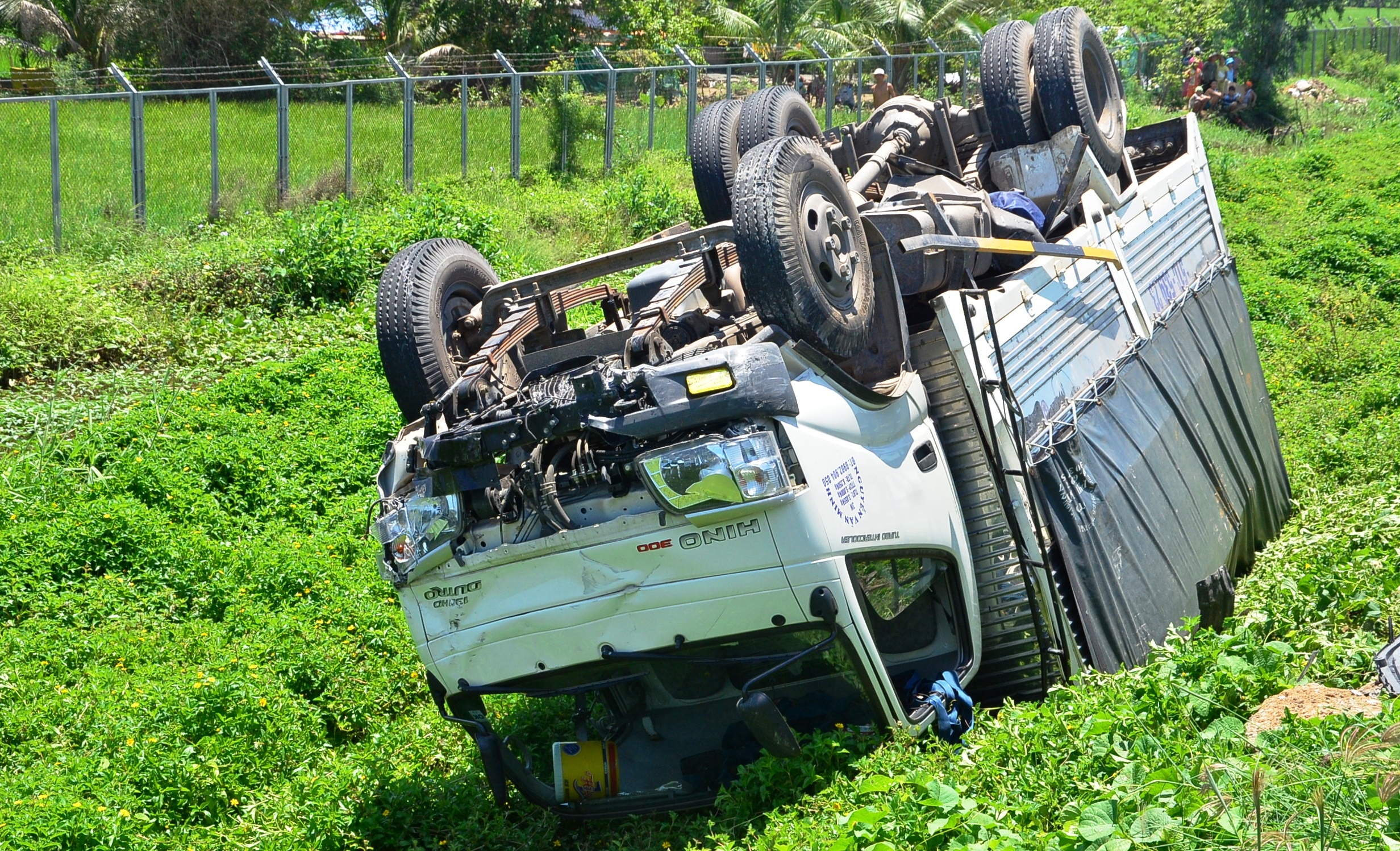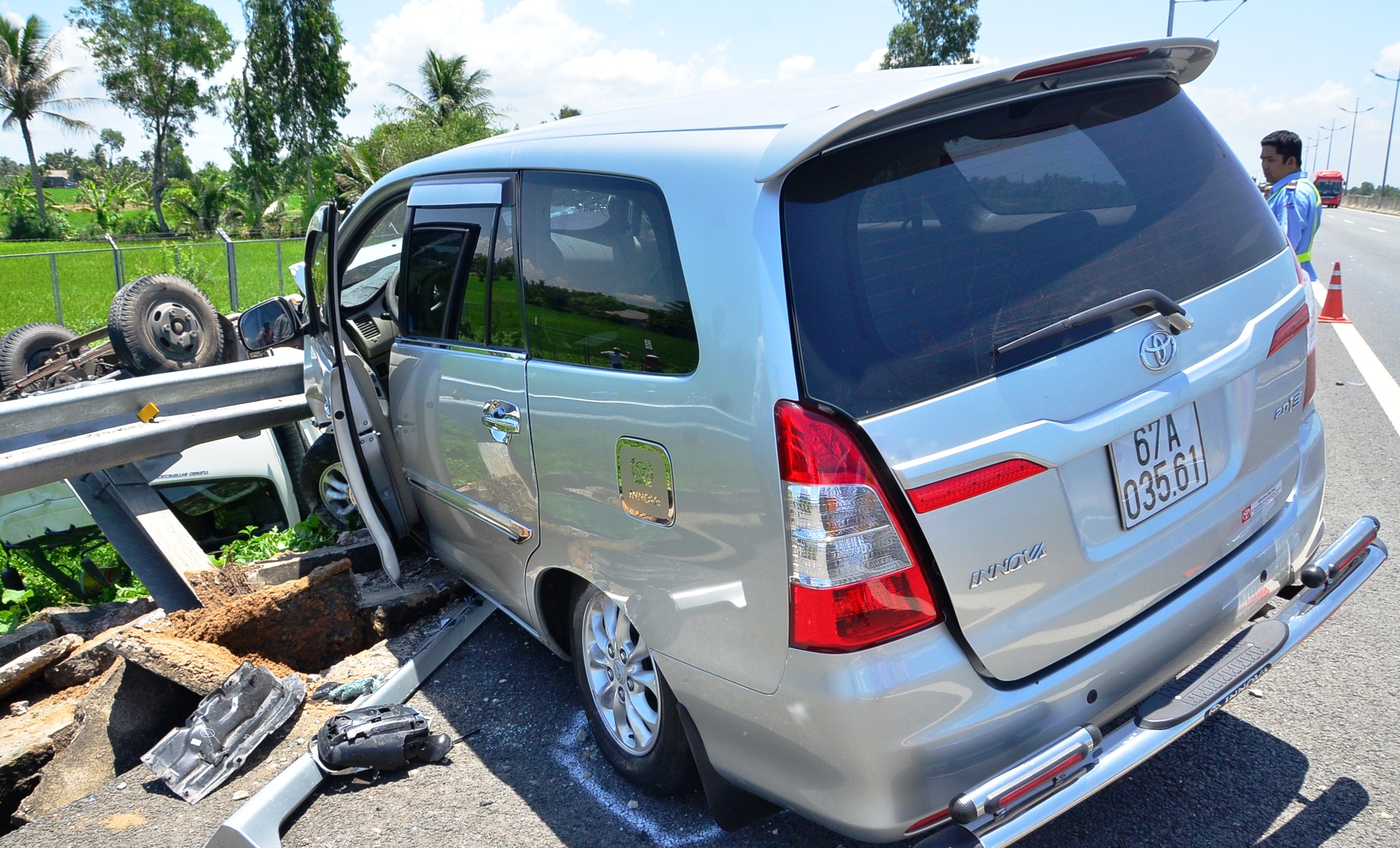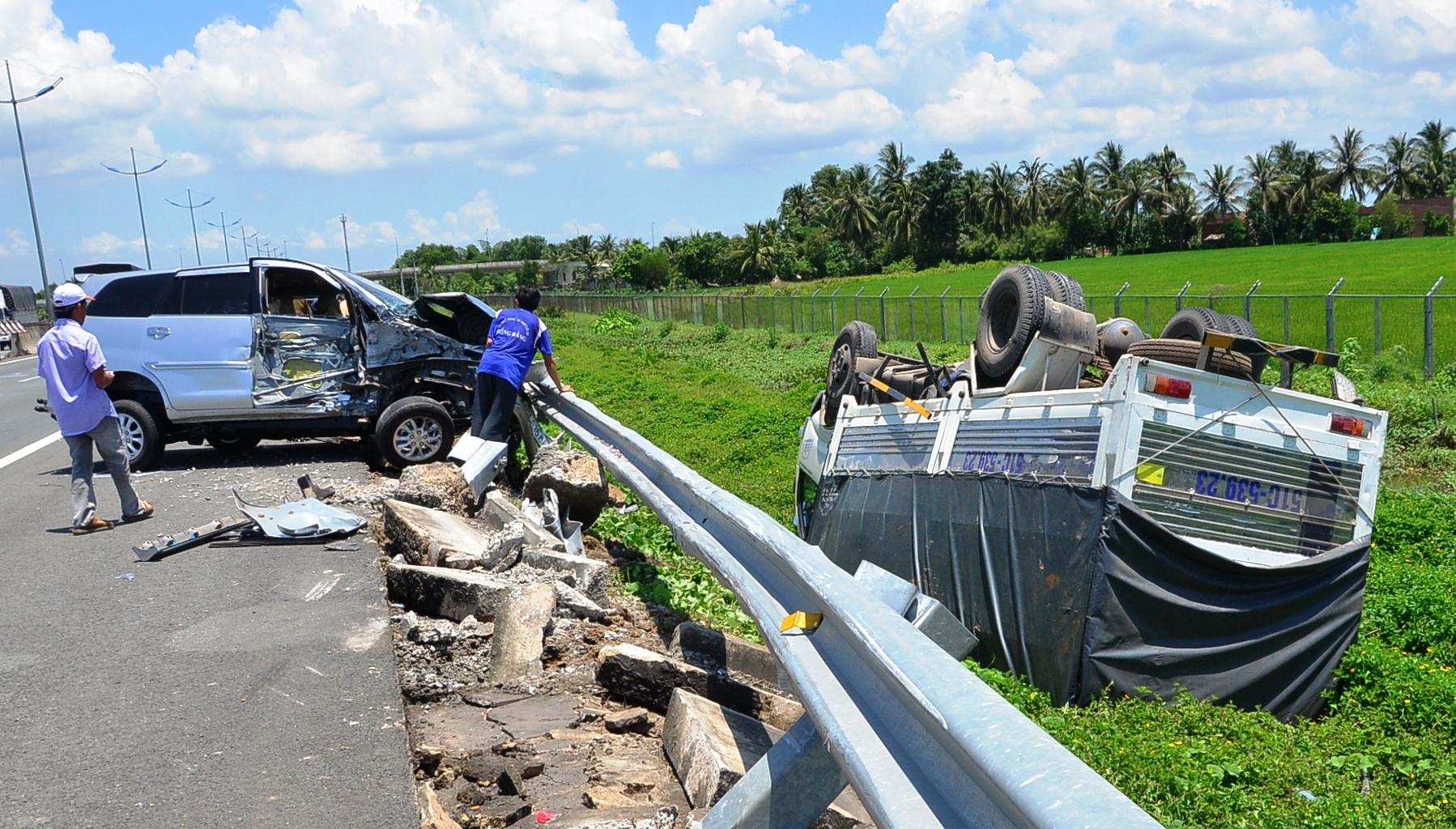 | Đến khu vực huyện Thủ Thừa, xe ông Minh bị ôtô 7 chỗ do ông Ngô Thành Trung (39 tuổi, quê An Giang) điều khiển cùng chiều từ phía sau lao đến tông mạnh vào đuôi. Do chạy tốc độ cao và bị tông bất ngờ, xe tải mất lái đâm vỡ một đoạn lan can, văng ra hành lang bảo vệ cao tốc rồi lật ngửa. |